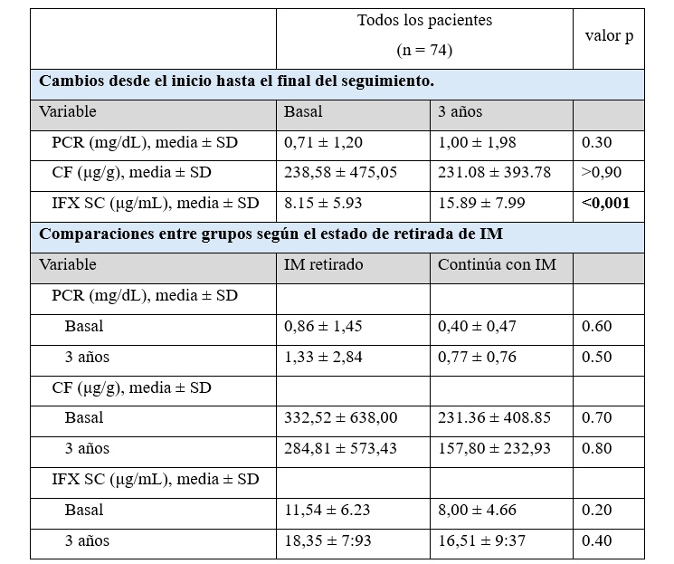 El uso concomitante de IM disminuyó de 38 pacientes (34,2%) al inicio a 15 (13,5%) al final del seguimiento. Según el grupo de pacientes a los que se les suspendió o no el IM, no se observaron diferencias significativas en los marcadores inflamatorios ni en las concentraciones de IFX SC.