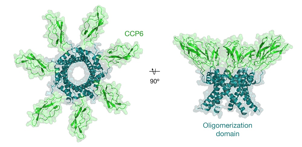 Figura 1. Representación gráfica de la estructura oligomérica de Heptammune (PRP6-HO7) predicha a partir de modelaje molecular. El dominio CCP6 N-terminal y el dominio de oligomerización C-terminal se muestran en verde y azul, respectivamente