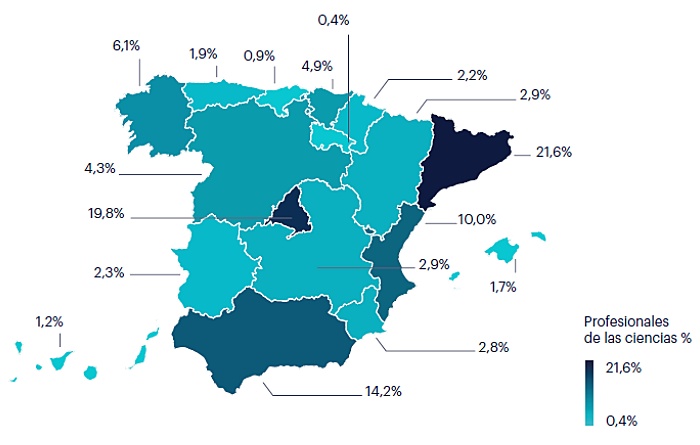 En el sector de Profesionales de las ciencias, Cataluña encabeza con el 21,6% del total de empleados en esta profesión, seguida de Madrid con el 19,8% y Andalucía con el 14,2%. En Técnicos de apoyo científico, la comunidad catalana copa el 24,2% del total de empleados nacionales, por delante de Madrid con el 12%, Andalucía con el 11,7% y Comunidad Valenciana con el 9,8%.
