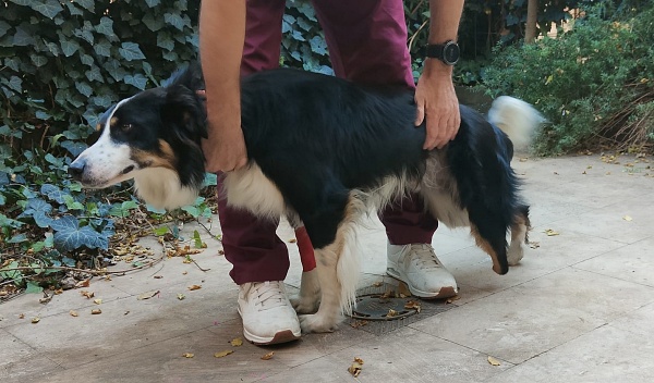 El perro operado, al cabo de unos días de la cirugía, es decir, en pleno proceso de rehabilitación, acostumbrándose poco a poco a la prótesis