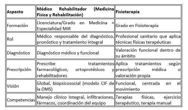 Finalmente, y a modo de aclaración divulgativa con respecto al concepto de ‘fisioterapia rehabilitadora’, Bascuñana especifica que este término “es conceptualmente incorrecto y genera confusión. La rehabilitación es un proceso médico integral -liderado por el especialista en Medicina Física y Rehabilitación- en el que la fisioterapia figura como una herramienta terapéutica dentro de un abordaje multidisciplinar”. La siguiente tabla describe las diferencias entre ambos términos: