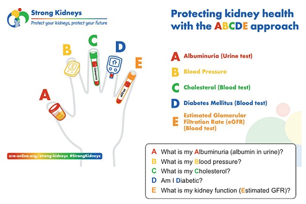 Figura sobre el ABCDE renal. A de albuminuria, un análisis de orina / B de blood pressure (tension arterial en inglés) / C de colesterol, un análisis de sangre / D de diabetes (medir glucosa en sangre), un análisis de sangre / E de eGFR, un análisis de sangre